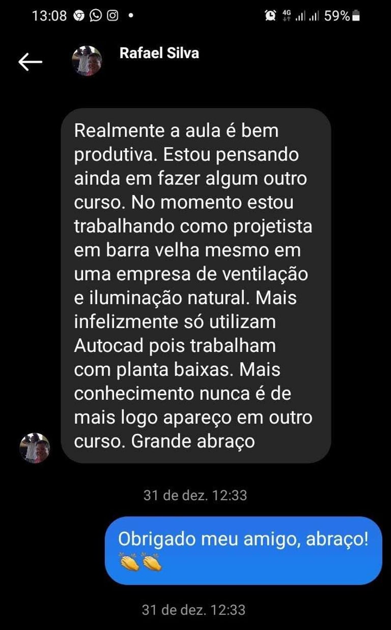 O curso realmente atendeu minhas expectativas, tinha muita dificuldade em aprender, mas com esse curso pude alcançar meus objetivos. Além disso, a metodologia adotada pelo professor facilitou bastante a compreensão dos conteúdos, proporcionando uma vivência prática.